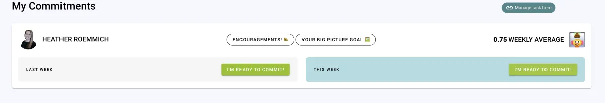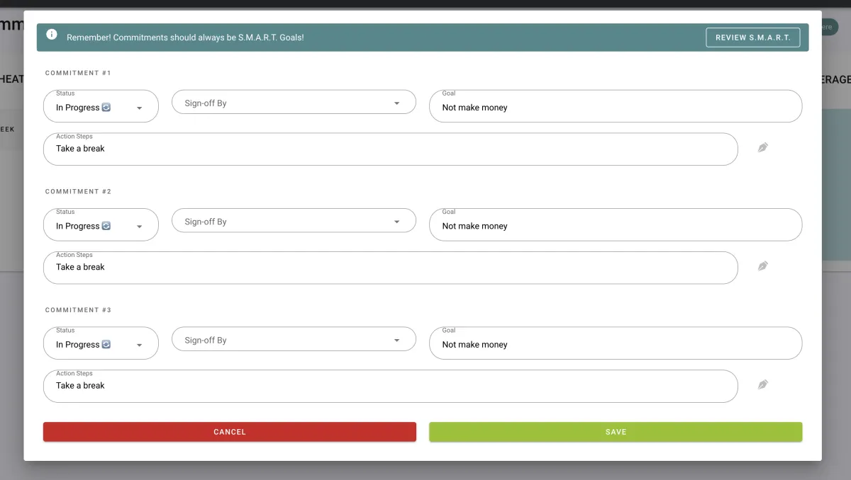 You will now click on the pencil button and put in your 3 commitments for the week. This will include your Goal and Action Items for each. Remember they need to be actionable, measurable and specific. Once you have completed them, you will change the status of your commitment to completed.